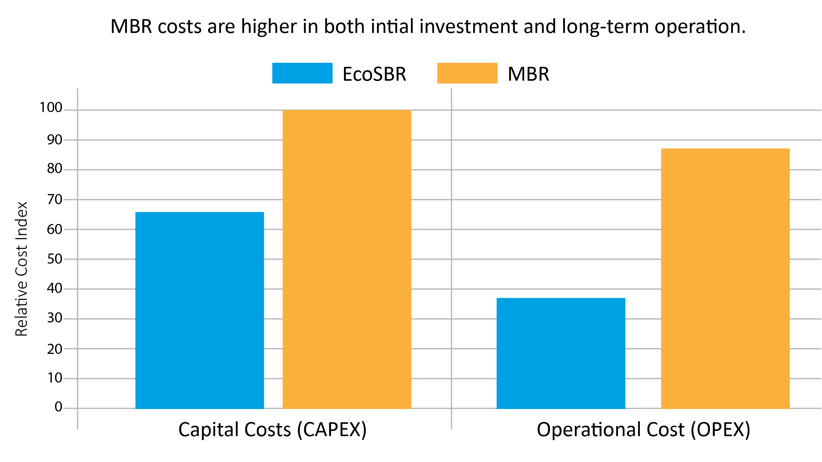 MBR's higher capital costs for membranes and significant operational costs for energy and maintenance create a stark contrast with EcoSBR's more economical profile.
